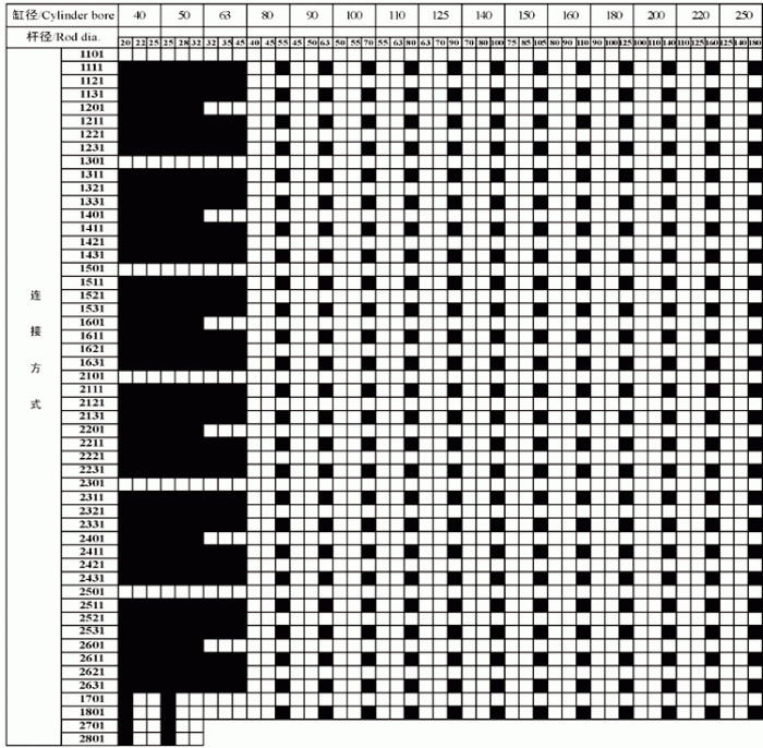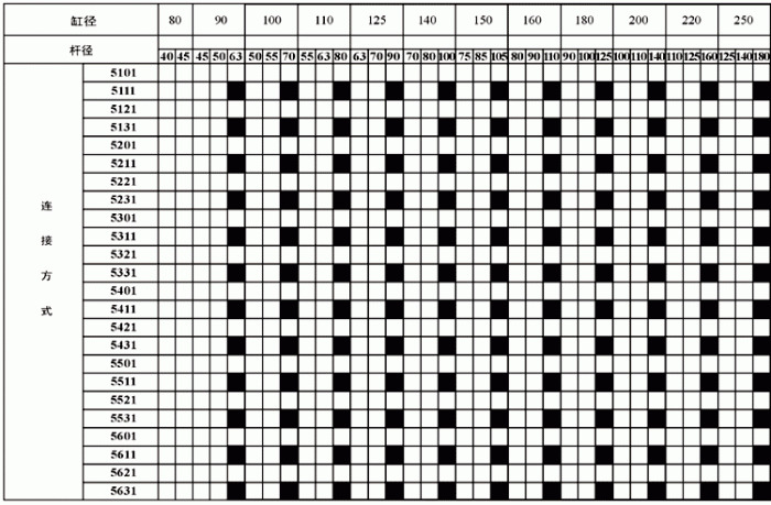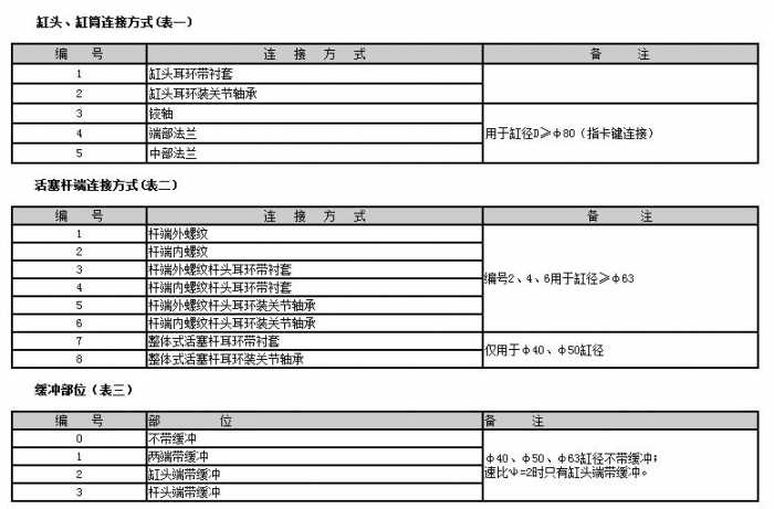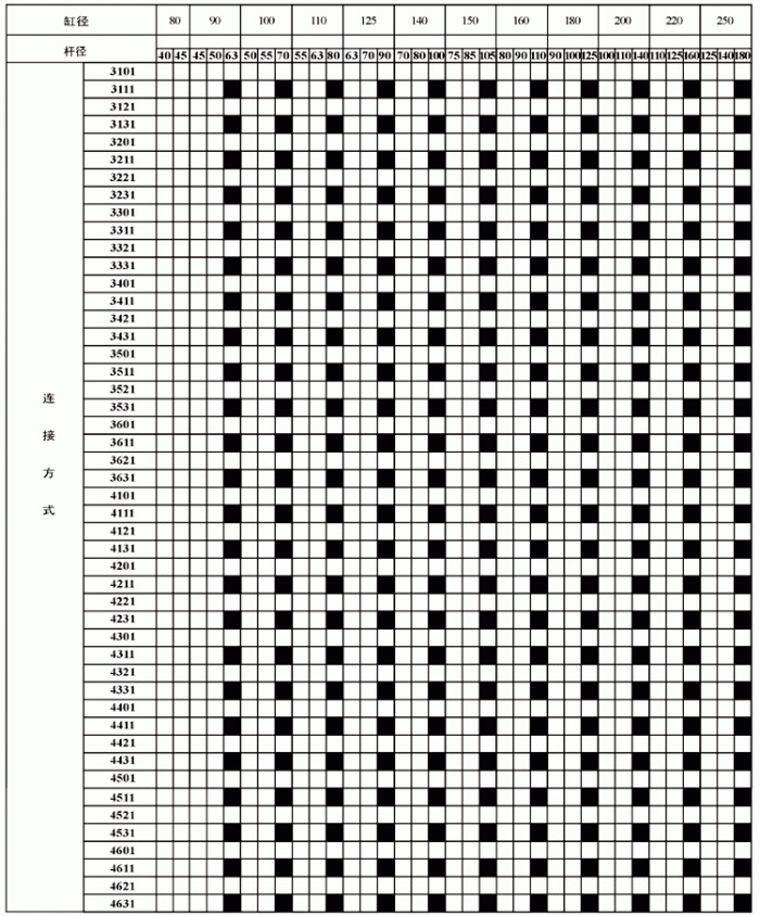 用戶選型完后,請(qǐng)將選用的主參數(shù)(缸徑、活塞桿徑)及連接方式編號(hào)與下表進(jìn)行核對(duì),以免選型差錯(cuò)。