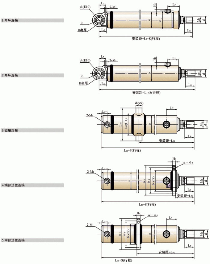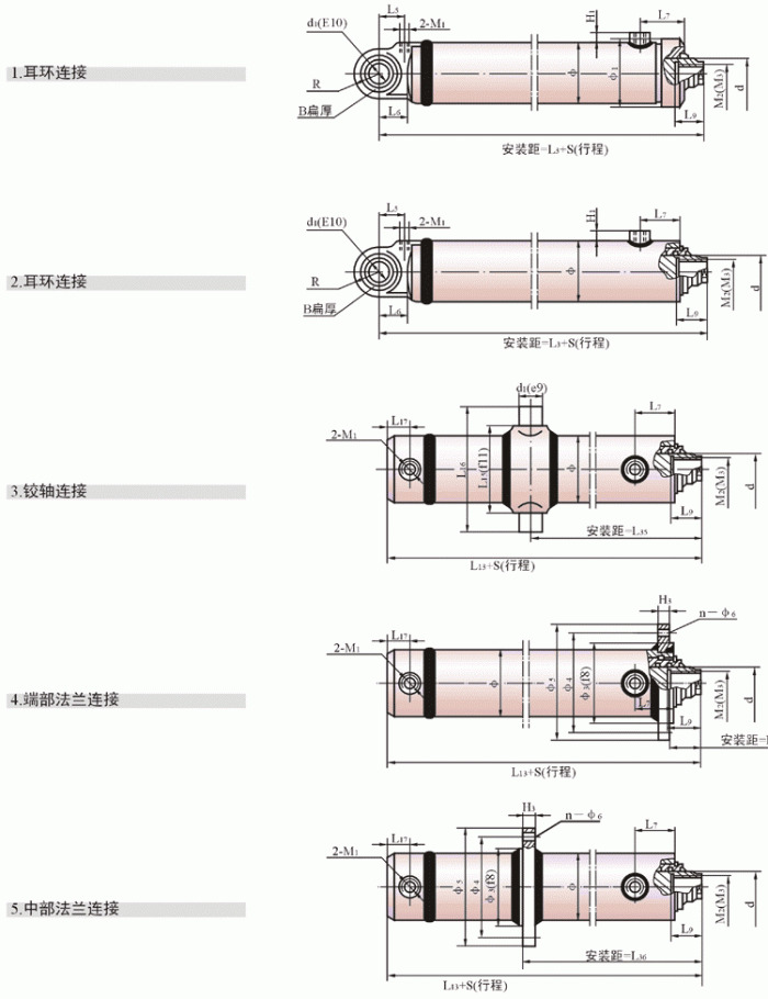 2.活塞桿端為外螺紋桿頭耳環(huán)連接:
