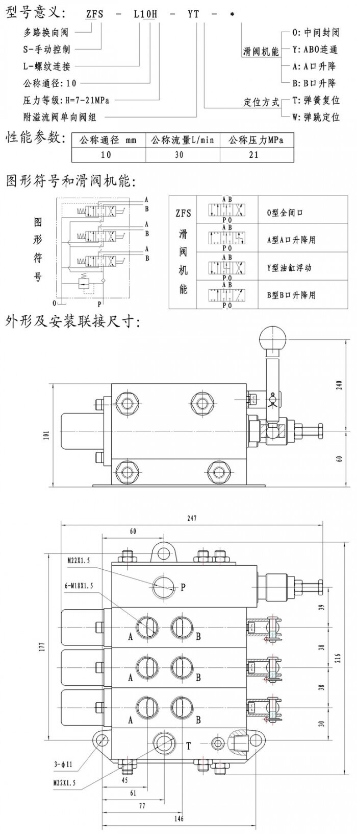 zFs—L1 0H型多路換向閥是手動換向的組合閥,主要用于起重運輸車輛,工程機械及其它行走機械,以進行多個工作機構(gòu)(液壓缸或液壓馬達)的集中控制。該閥由二到五個三位六通手動換向閥,溢流閥和單向閥組成,根據(jù)用途的不同,滑閥處于中間位置時,主油路有中間全封閉式,壓力口封閉及A、B腔封閉式等幾種滑閥機能,且各閥處于中間位置時,壓力油短路御荷,該閥有公共進油口和回油口,各控制閥有兩個工作油口以連接油缸或液壓馬達,為螺紋聯(lián)接方式,定位方式有彈簧復位和彈跳定位。zFs—L1 0H型多路換向閥為并聯(lián)式,并聯(lián)式的特點是主液壓泵同時向多路換向閥控制的工作機構(gòu)供油,各工作機構(gòu)的工作壓力即是液壓泵的出口壓力,每個換向閥可獨立操縱,也可幾個閥同時操縱復合動作。