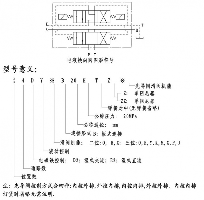 電液換向閥是由電磁換向閥和液動換向閥組合而成。電磁換向閥起先導(dǎo)控制作用,使液動滑閥換向進(jìn)行路卸載、順序動作作以改變油流方向等來控制液壓系統(tǒng)中的執(zhí)行元件的動作(如油缸的往返、油馬達(dá)的回轉(zhuǎn)等),起到與單獨的電磁換向閥相同的作用。