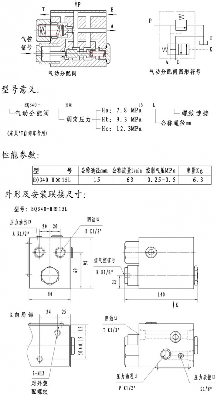 1.氣動(dòng)分配閥是常開(kāi)式二位四通換向閥與直動(dòng)式溢流閥的復(fù)合??捎糜谝磺杏袎嚎s空氣源的工程機(jī)械、運(yùn)輸機(jī)械等的液壓系統(tǒng)中,能可靠地控制工作油缸的舉升,有效地防止液壓系統(tǒng)過(guò)載,實(shí)現(xiàn)系統(tǒng)卸荷,起到安全、節(jié)能作用。有氣控信號(hào)時(shí),二位四通換向閥換向,P與T斷開(kāi)與A接通,系統(tǒng)在溢流閥限定壓下工作,溢流閥起安全作用。無(wú)氣控信號(hào)時(shí),換向閥在彈簧作用下復(fù)位,P、A與T接通,